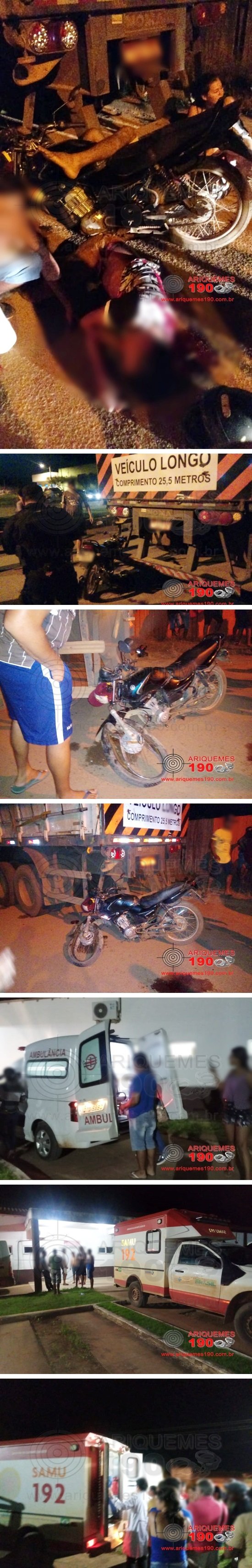 Durante a noite deste domingo 21/04, a equipe de socorro do hospital municipal de Alto Paraíso foi acionada a comparecer na Avenida Jorge Teixeira, onde havia acontecido um acidente. No local, dois rapazes estavam gravemente feridos, sendo que um estava ao solo e o outro estava debruçado sob a moto. A Polícia Militar também esteve no local, onde ao coletar os dados, os Militares foram informados que os dois rapazes transitavam em uma motocicleta da marca Yamaha, modelo YBR de cor preta, quando a moto colidiu na traseira de um semi-reboque. Ambos os jovens foram conduzidos ao hospital municipal, onde após o primeiro atendimento, foram encaminhados ao Pronto Socorro em Ariquemes para receber atendimento médico especializado. O Boletim de Ocorrência de Acidente de Trânsito (BOAT) foi registrado para a tomada das providências.