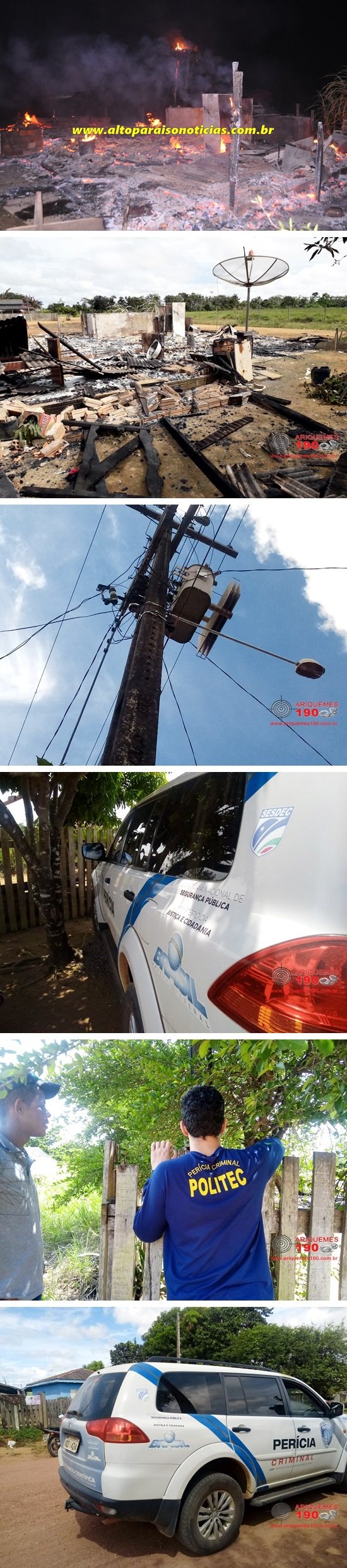 Por volta das 21h30m, deste sábado 20/04, a guarnição da Polícia Militar foi acionada a comparecer em uma residência na Rua Lírio no Jardim Primavera em Alto Paraíso, onde estaria acontecendo um incêndio. Ali chegando, a proprietária da casa relatou que foi para a igreja, quando retornou a casa de madeira estava em chamas, onde o fogo consumiu toda a casa, móveis, eletros e documentos que estavam no interior da mesma. Vizinhos relataram que desde as 18 horas, várias quedas de energia aconteceram no local. A Polícia Técnico Científica (POLITEC) esteve no local e realizou a perícia para apurar as causas do incêndio. Diante do exposto, foi registrado o Boletim de Ocorrência Policial (BOP) para a tomada das providências.