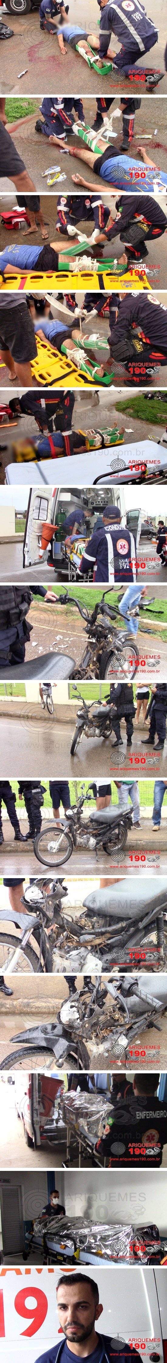 ARIQUEMES: Rapaz sofre fraturas expostas nas duas pernas após colisão de moto com caminhonete na Av. Machadinho