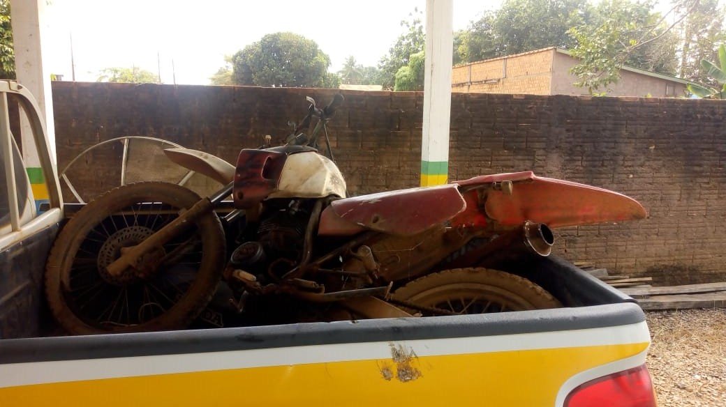 Em patrulhamento pela Vila Ebesa ao realizar abordagem em uma residência foi localizado o veículo e em consulta ao número do motor constou restrição de roubou ou furto. A moto estava sem placa ao realizar consulta pelo chassi verificou se que a moto estava em situação legal, porém ao checar o número do motor da mesma verificou se que pertencia a outra motocicleta que consta roubo ou furto. Diante do exposto, a guarnição composta pelos Soldados Carvalho, Elcione e Fiori entregou a moto na Delegacia de Polícia Civil de Alto Paraíso, para a tomada das providências.