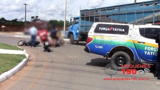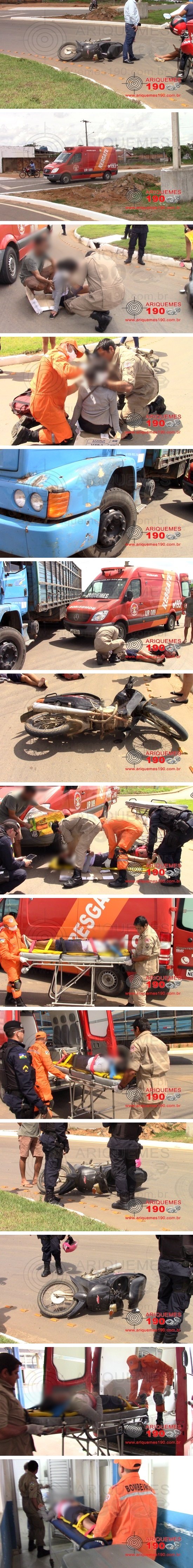 ARIQUEMES: Mulher fica ferida em acidente entre moto e caminhão