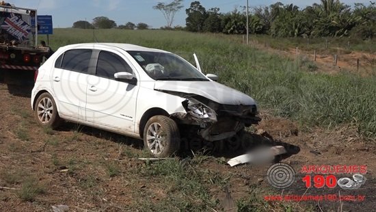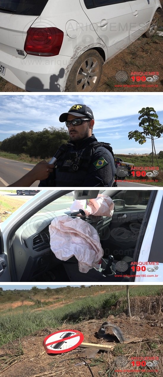 ARIQUEMES: Condutora faz ultrapassagem, perde controle de direção e colide com placa de “proibido ultrapassar” na BR-364