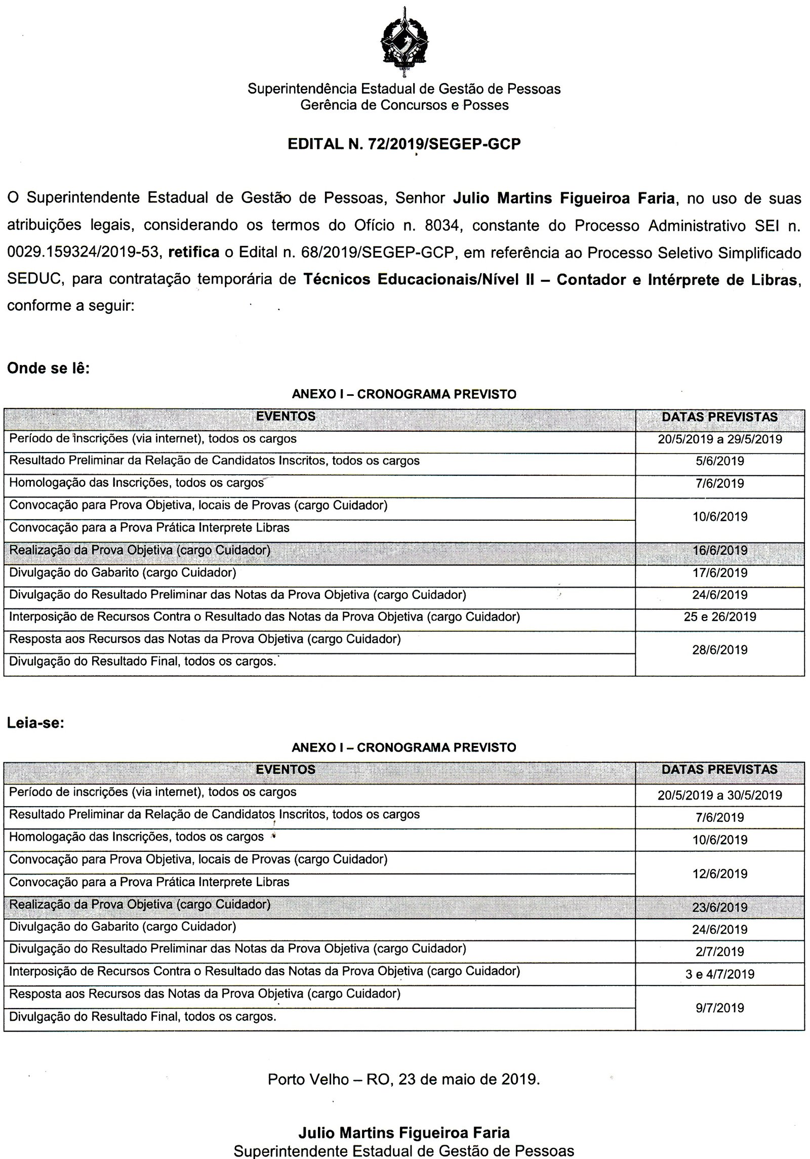 Edital n. 72/2019/SEGEP-GCP – Convocação Prova Pratica Processo Seletivo SEDUC – Técnico Educacional Interprete Libras