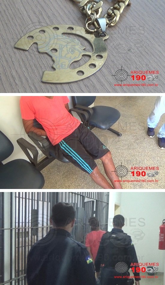 Na tarde desta segunda-feira 08/07, um Agente Penitenciário transitava próximo ao camelódromo, quando avistou um indivíduo suspeito demonstrando muito nervosismo e tentando se evadir. Ao notar que seria abordado, o elemento empreendeu fuga e acabou sendo alcançado. Na mão do indivíduo foi encontrada uma corrente com pingente que segundo o marginal, havia sido furtada em um dos camelôs. O Agente também reconheceu o indivíduo como sendo um foragido da Justiça de Machadinho do Oeste. Diante do exposto, o elemento foi conduzido a Unidade Integrada de Segurança Pública (UNISP) onde foi registrado o Boletim de Ocorrência Policial (BOP) para a tomada das providências.