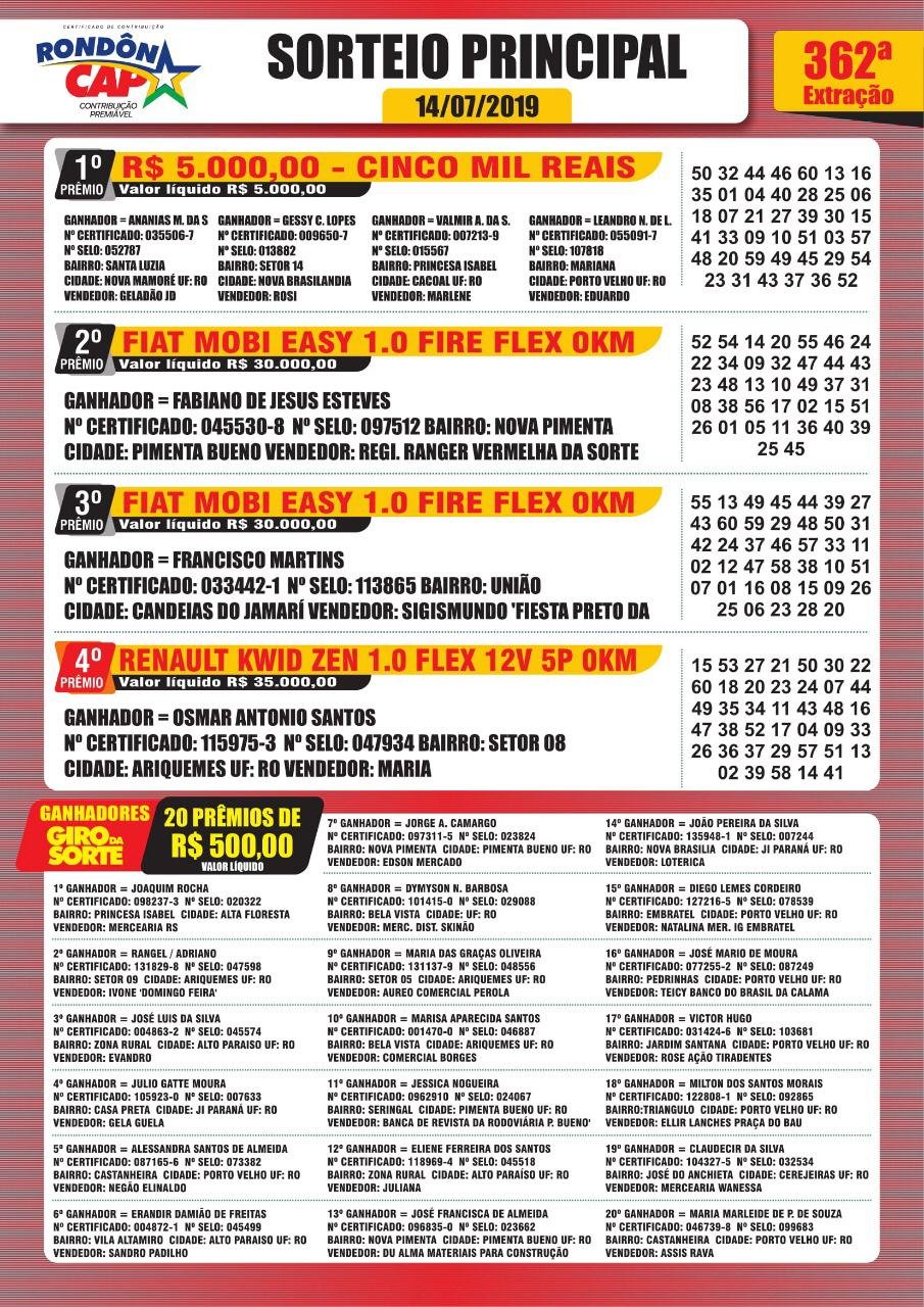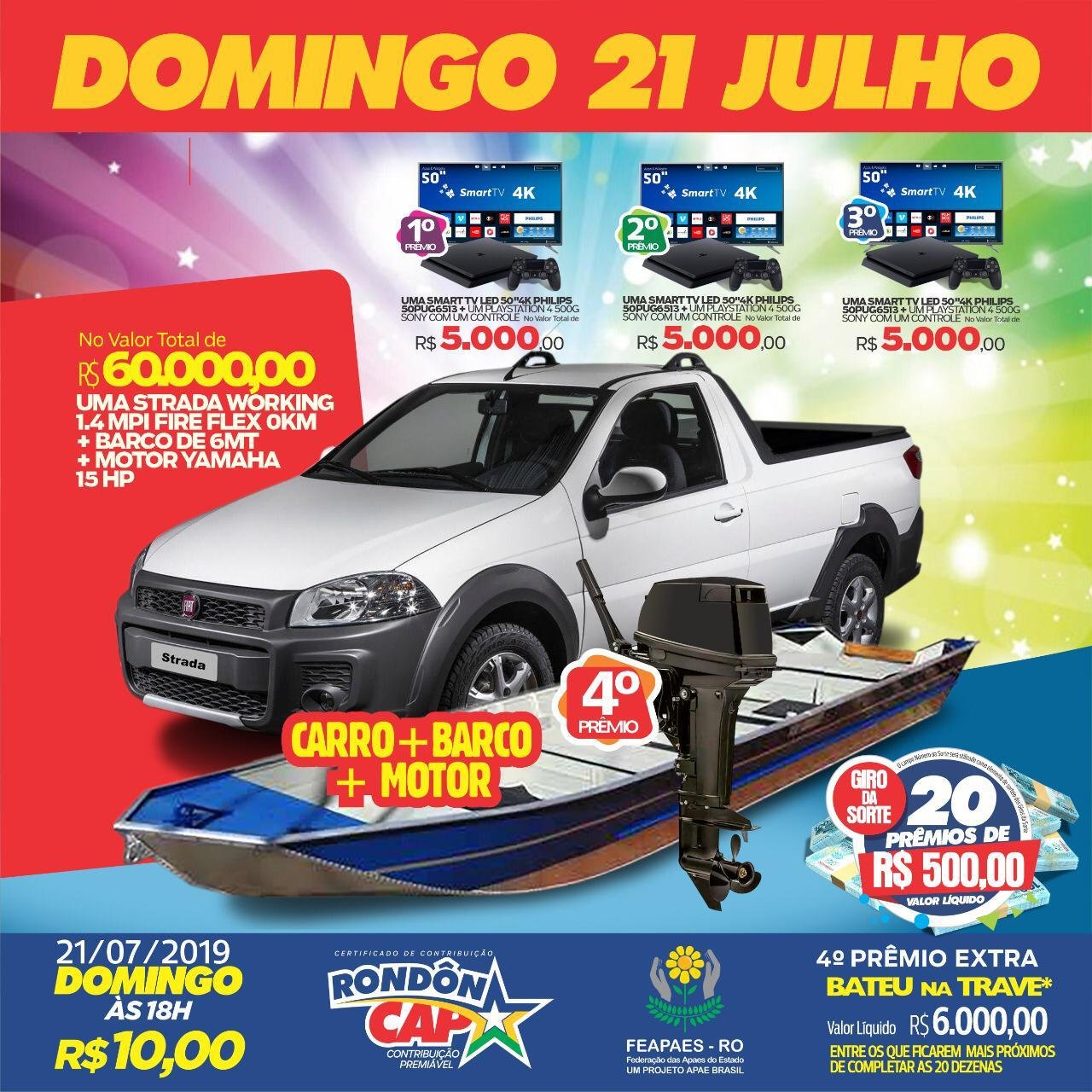 Os prêmios saíram para as cidades de: Porto Velho, Nova Mamoré, Cacoal, Nova Brasilândia, Pimenta Bueno, Candeias do Jamari, Alta Floresta do Oeste, Alto Paraiso, Ji Paraná e Cerejeiras; no Cone Sul. E para você aproveitar as férias nos rios da nossa região, no próximo domingo o Rondoncap vai sortear uma PICK UP STRADA com um BARCO e MOTOR juntinhos no quarto prêmio; serão 60 mil reais só no quarto prêmio. Compartilhe amor, multiplique emoções; ajude as APAES de Rondônia e deixe a sorte ajudar você. Rondoncap, pode acreditar a sua sorte vai chegar.