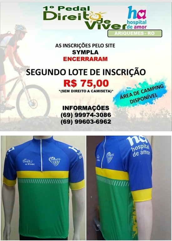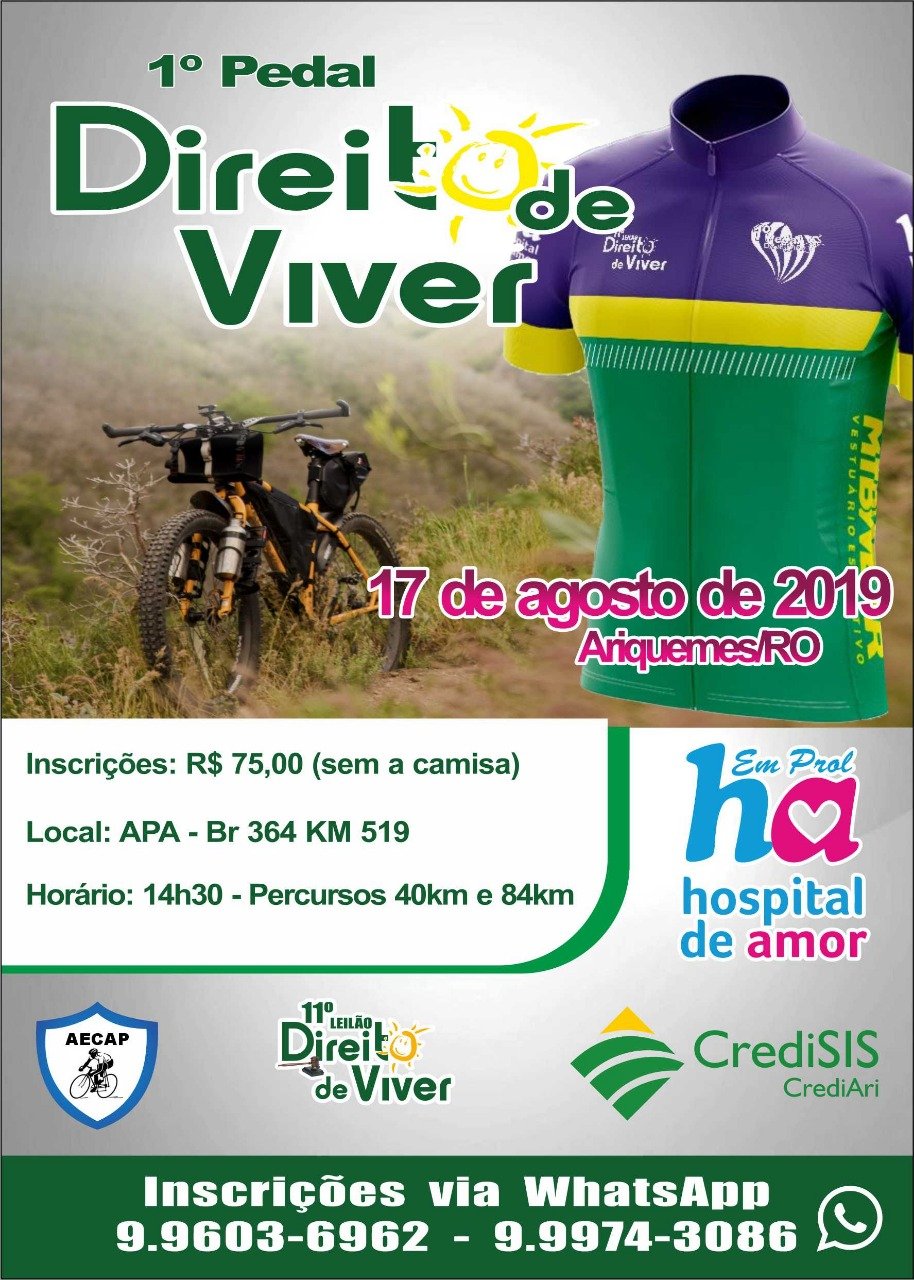 Neste sábado 17/08, acontecerá o 1° Pedal Direito de Viver. Com saída na Associação dos Pecuaristas de Ariquemes, o Pedal terá percursos de 40Km e 84Km. As inscrições sem a camiseta estão R$ 75,00 e podem ser feitas através do WhatsApp 9 9603-6963 ou 9 9974-3086. Participe deste grande evento, se exercite e ainda ajude o Hospital de Amor.