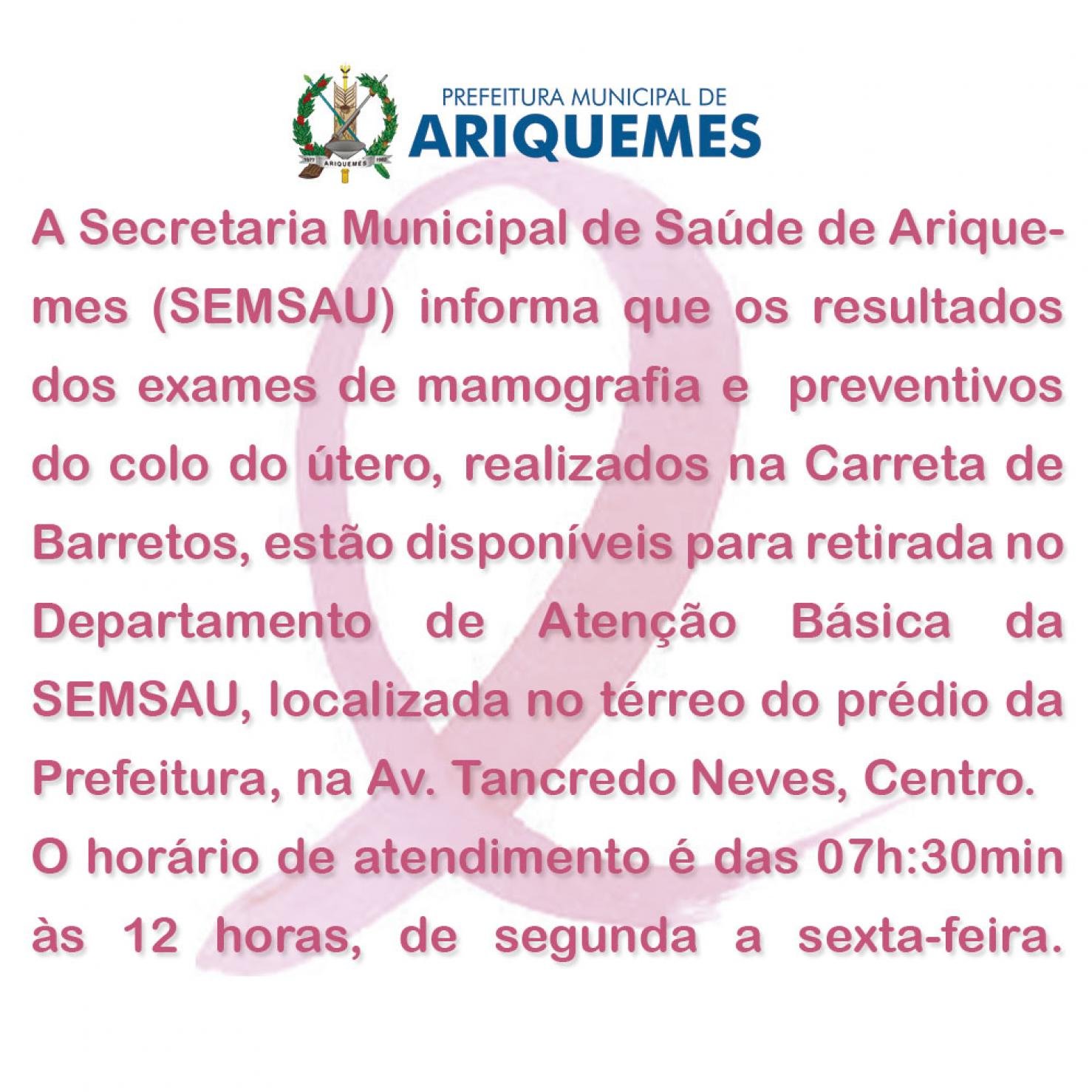 A Secretaria Municipal de Saúde de Ariquemes (SEMSAU) informa que os resultados dos exames de mamografia e do colo do útero , realizados na Carreta de Barretos, estão disponíveis para retirada no Departamento de Atenção Básica da SEMSAU, localizado no térreo da Prefeitura, na Av. Tancredo Neves, Centro.