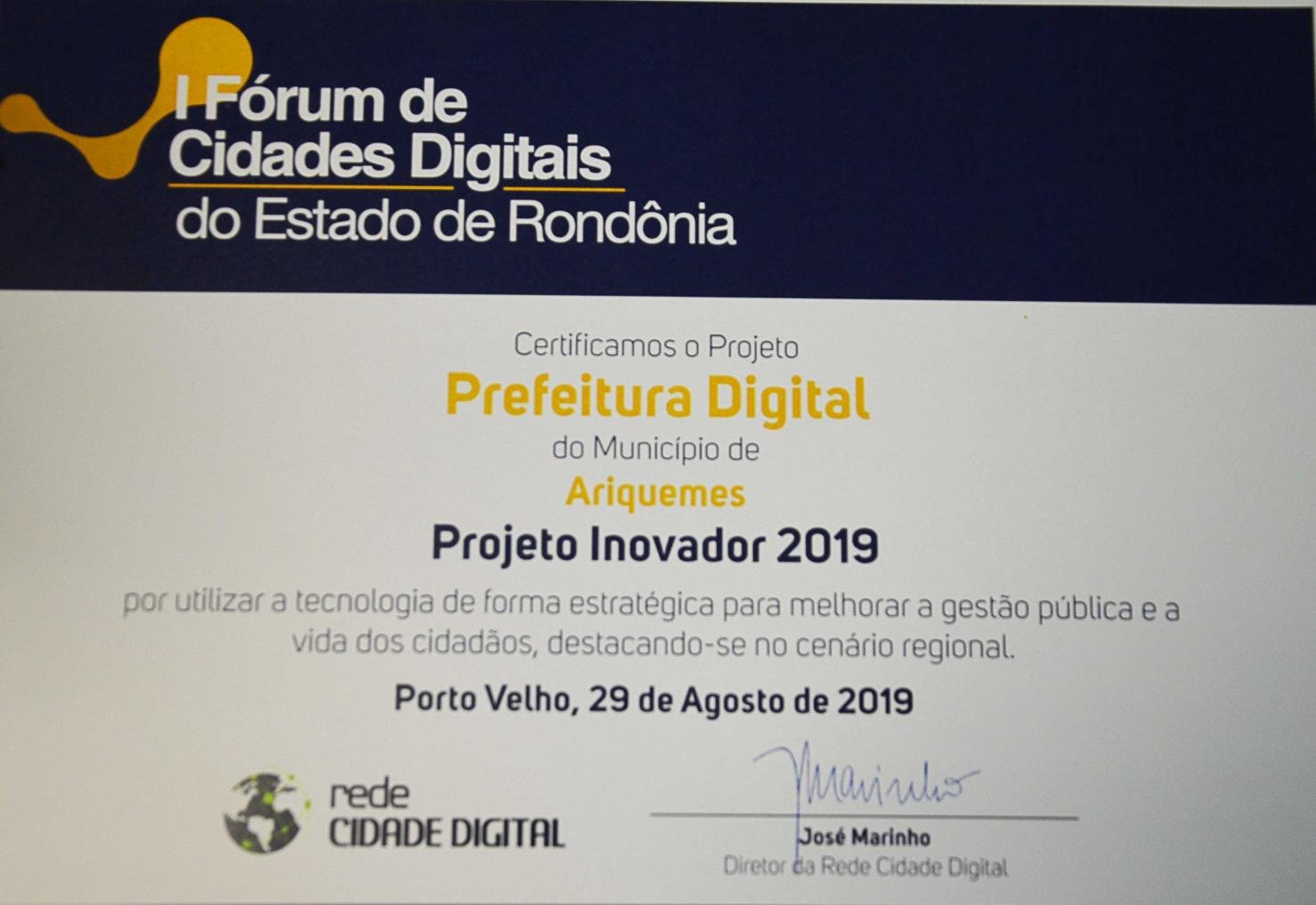 Sete dos cinquenta e dois municípios de Rondônia receberam o Prêmio Nacional, com destaque no cenário regional, pela implementação de projetos digitais inovadores que utilizam a tecnologia de forma estratégica para melhorar a gestão pública e a vida dos cidadãos. Ariquemes foi contemplada pelo projeto piloto “Prefeitura Digital”, que dispõe internet wi-fi gratuita nas Praças Manoel Martins, no setor 09, e a Quero - Quero, no bairro Jardim Europa, implementado a custo zero para o município. A cidade também foi destaque pelo monitoramento de segurança em pontos estratégicos, e por sua Infovia, sistema de comunicação digital entre os prédios públicos. “Os organizadores fizeram pesquisas nas iniciativas de cidades digitais pelo estado e identificaram nossos projetos que já funcionam hoje, com destaque para o ‘Prefeitura Digital’, mas também nossa infovia, que compreende pelo menos setenta prédios públicos interligados, incluindo a rede da educação rural, e as iniciativas do monitoramento por câmeras de segurança. Isso gerou este certificado de reconhecimento de projetos inovadores 2019.” Explicou Fábio Milani, diretor do Departamento de Tecnologia da Informação (DTI), da Prefeitura de Ariquemes.