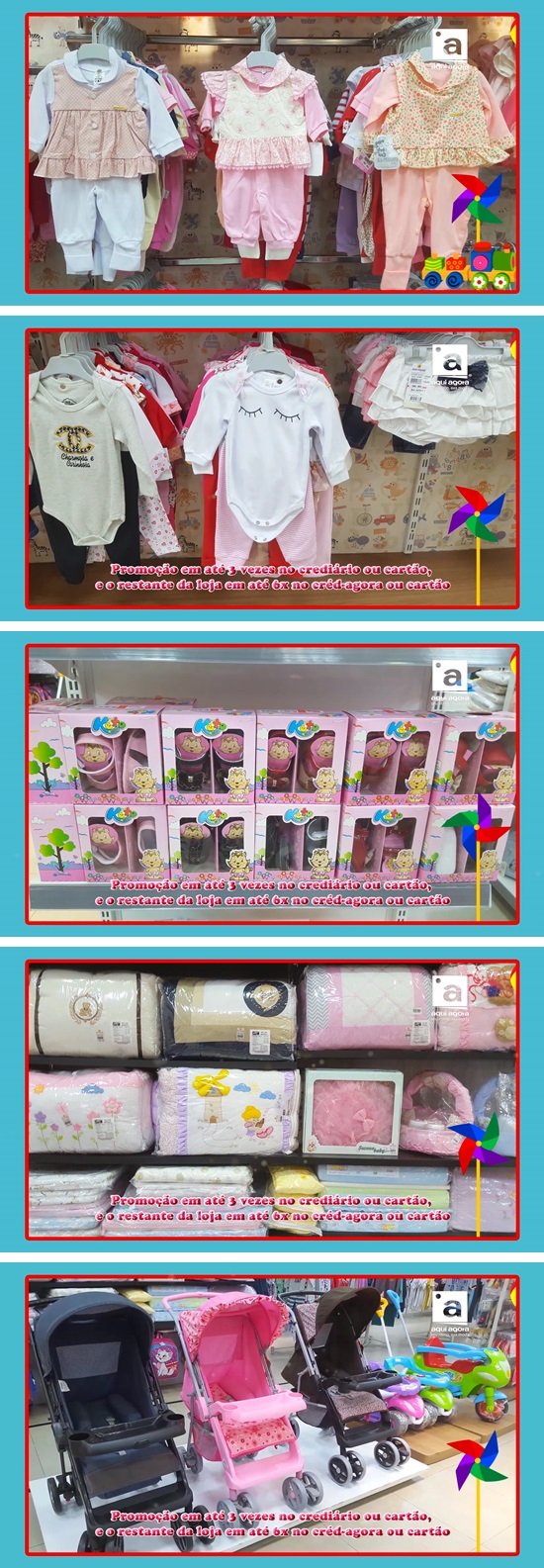 Promoção válida em até três vezes no crediário ou cartão, e o restante da loja em até 6x no créd-agora ou cartão. Promoção “a hora e a vez dos bebês”, de 02 a 06 de setembro. Lojas aqui agora, seu ritmo, sua moda