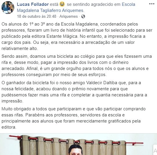 O Vice Prefeito de Ariquemes Lucas Follador (DEM) parabenizou através de sua página no Facebook os alunos e professores da Escola Magdalena, pela elaboração do livro de história infantil que foi selecionado para ser publicado pela editora Estante Mágica. Confira a postagem.
