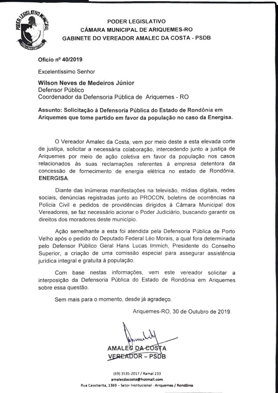 Cobrança indevida, consumidores com dificuldades para acessar informações e corte de fornecimento de energia elétrica, troca de relógio de energia irregulares são alguns dos problemas levantados pelo Vereador Amalec da Costa (PSDB), fatos suficientes para que o representante do povo de Ariquemes fosse até a defensora pública municiado de um oficio e um relatório consubstanciado fornecido pelo PROCON solicitando que a Instituição entre no caso em defesa do consumidor.