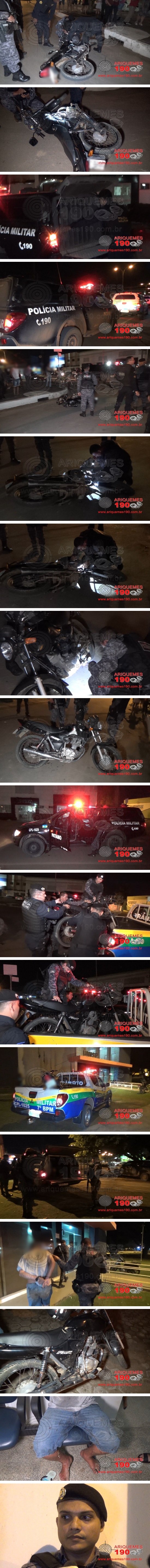 Na noite deste sábado 09/11, a Polícia Militar avistou uma motocicleta suspeita. Ao aproximar a viatura do veículo, o condutor empreendeu fuga em alta velocidade da Avenida Tabapuã e percorreu o centro da cidade até sofrer uma queda na Avenida Jamari. Em consulta veicular, foi constatado que a moto estava adulterada, pois a placa que estava na motocicleta, pertencia a uma moto Fan de cor vermelha. Além da placa, a motocicleta na verdade era de cor prata e havia sido pintada de preto. Diante do exposto, O condutor e o veículo adulterado foram apresentados na Unidade Integrada de Segurança Pública (UNISP), onde foi registrado o Boletim de Ocorrência Policial (BOP) para a tomada das providências. ‘