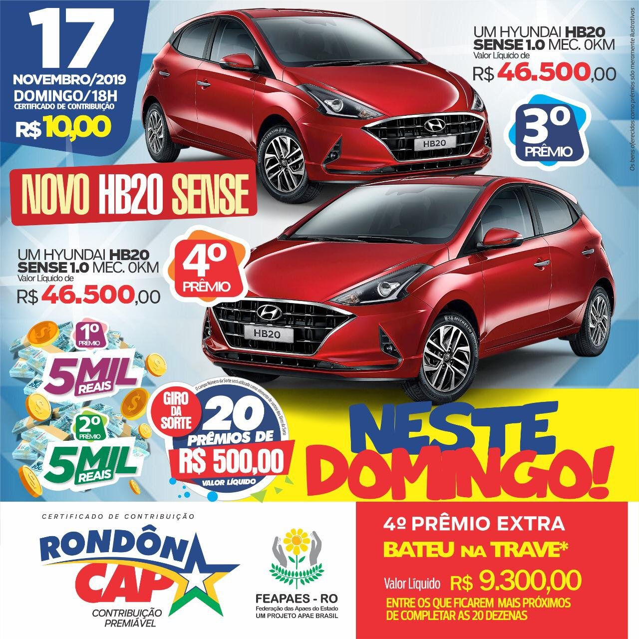 E neste domingo, o Rondoncap vai sortear dois carros NOVO HB20 zero quilometro. Compartilhe amor, ajude as APAES que a sorte pode ajudar você.
