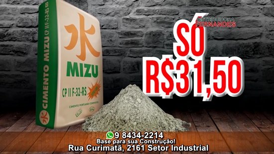 A Distribuidora Fernandes está com uma excelente promoção em cimento! Cimento Mizu só R$ 31,50. É isto mesmo! Cimento Mizu R$ 31,50. Venha e comprove, faça um orçamento conosco. Vendas no atacado e varejo. Distribuidora Fernandes a base para a sua construção! Rua Curimatã Setor Industrial ou ligue 9 8434-2214 WhatsApp.