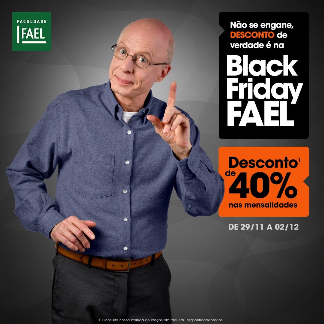 A FAEL lançou uma promoção imperdível de Black Friday! De 29/11 a 02/12 você fazendo sua matrícula já ganha esse descontão de 40% na mensalidade. Não é sorteio, é promoção de Black Friday. A FAEL estará aberta na sexta-feira normalmente, sábado até meio dia e segunda-feira normal. Não se engane, desconto de verdade é na FAEL que em Ariquemes está localizada na Avenida Tancredo Neves próximo a Avenida Guaporé.