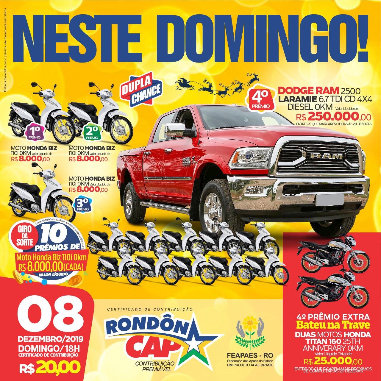 No próximo domingo, tem sorteio especial de dezembro: serão 15 Motos Honda e uma Caminhonete Dodge Ram no valor de R$ 250.000,00. Compartilhe amor, ajude a as APAES que a sorte pode ajudar você.