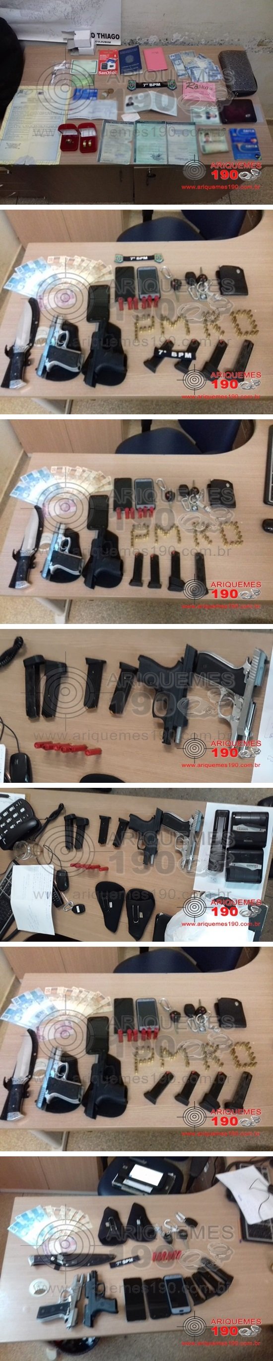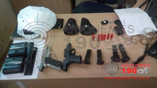 Durante a tarde deste sábado 07/12, a Polícia Militar foi informada de um furto em uma residência na área rural de Cujubim, na região Soldado da Borracha. A vítima relatou que dois homens e uma caminhonete da marca Toyota, modelo Hilux de cor branca foram vistos saindo de seu sítio levando seus bens. Imediatamente, a guarnição iniciou patrulhamento pelas Linhas próximas a cidade, quando saindo da zona urbana pela Linha CA14, a guarnição se deparou com uma caminhonete branca vindo em sentido contrário em alta velocidade. Foram dados sinais luminosos e sonoros e o condutor parou o veículo. Os PM’s orientaram que os elementos saíssem com as mãos para cima, momento que três indivíduos saíram e o outro permaneceu no interior da caminhonete. O elemento que estava dentro do veículo usava uma camiseta vermelha, sendo que populares descreverem um dos elementos com a referida camiseta. Ao ser indagado o motivo de permanecer na interior da caminhonete, o sujeito relatou que estava dormindo. A guarnição orientou os suspeitos para acompanharem as buscas no veículo, momento que ao abrir a tampa traseira, foi localizada a mochila da vítima contendo, roupas, carteira com documentos, cartões de banco, R$ 70,00 em espécie, cheques, três alianças e dois cartões de memória. Na carroceria, foi encontrada também uma faca, um motosserra, uma sacola de correntes de motor, uma lanterna e um botijão de gás. Os bens foram reconhecidos pela vítima como sendo de sua propriedade. Foi dada voz de prisão aos elementos, em seguida, foi realizada uma busca minuciosa, onde embaixo do banco traseiro da caminhonete, foram encontradas duas pistolas da marca Taurus, calibre .380 e com as armas, também foram encontrados 6 cartuchos calibre 32. A guarnição se deslocou até a propriedade onde ocorreu o furto, sendo constatado que os elementos arrombaram a porta e reviraram a residência. A vítima relatou também que um cartão de banco com senha foi subtraído pelos elementos. Diante do exposto, os marginais e os bens foram apresentados na Unidade Integrada de Segurança Pública (UNISP), onde foi registrado o Boletim de Ocorrência Policial (BOP) para a tomada das providências que o caso requer.