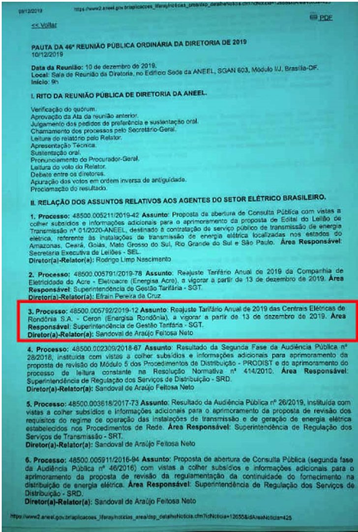 A sessão ordinária começa às 9h, em Brasília. O processo nº 48500.0005791/2019-12 será o terceiro item da pauta e terá como relator Sandoval de Araújo Feitosa Neto. Não consta na pauta, o percentual de reajuste requerido pela Energisa.