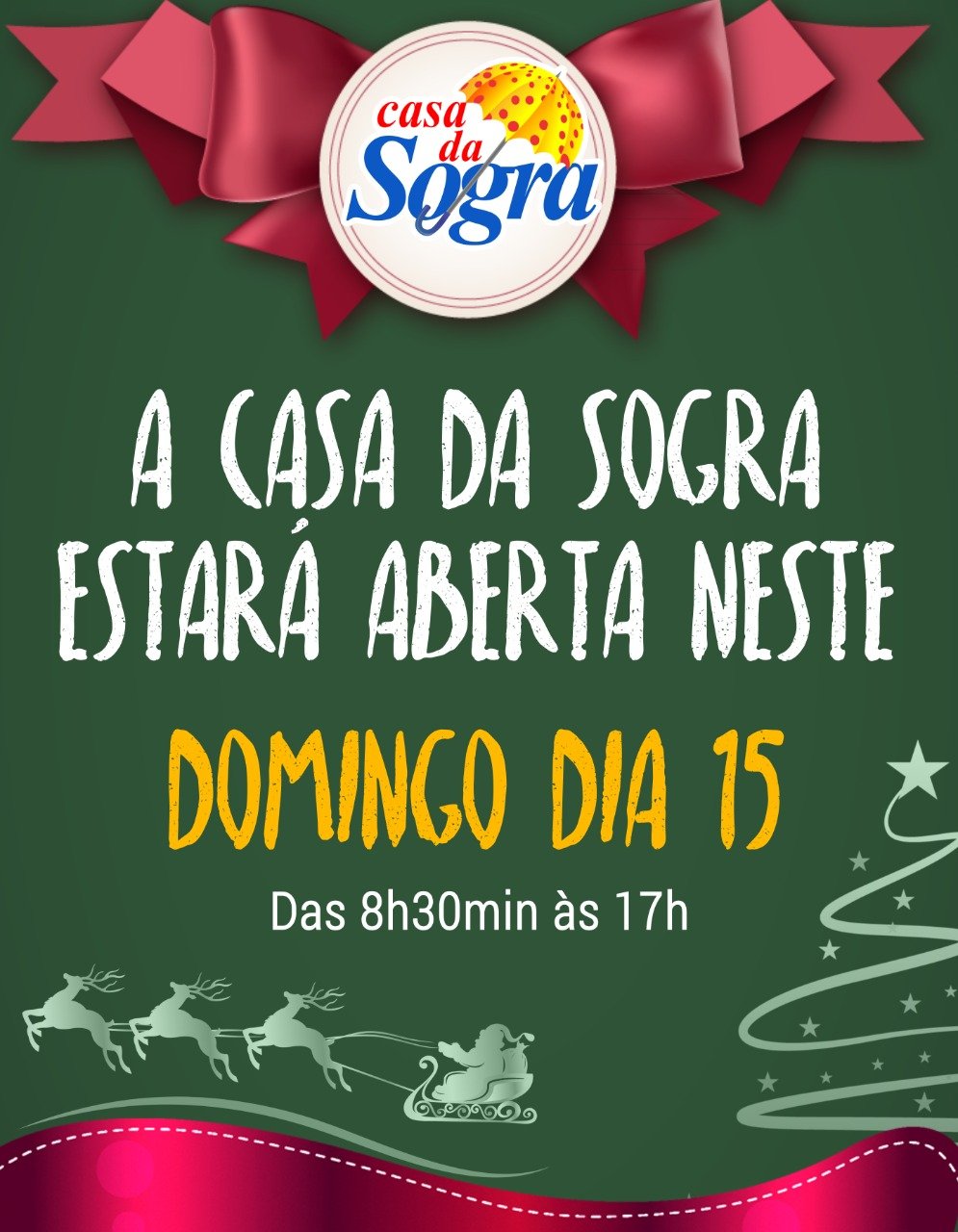 A Casa da Sogra sempre pensando em facilitar suas compras, abrirá neste domingo 15/12 das 8h30m às 17 horas, oferecendo muitas opções em confecções, calçados e acessórios femininos, masculinos e infantis. Na Casa da Sogra você também encontra linha para recém-nascidos, cama, mesa e banho. O pagamento também é super facilitado, onde você pode parcelar suas compras no cartão ou crediário e ainda acumula bônus que podem ser trocados por mercadorias da loja. Comprando na Casa da Sogra você ganha raspadinhas do Natal da Sorte e concorre uma viagem ao litoral brasileiro com acompanhante. Corra para a Casa da Sogra e aproveite. Casa da Sogra, a nossa casa na Alameda Piquiá centro, telefone 3535-7612.
