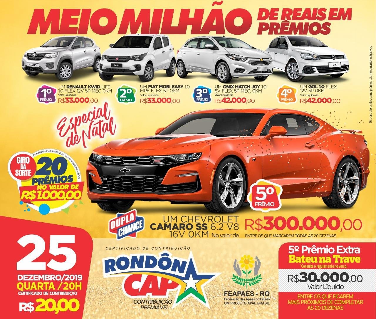 O Rondon Cap é um Certificado de Contribuição Premiável que agrária recursos para ajudar as APAE’s de Rondônia no belíssimo trabalho de acolhimento, atendimento e inclusão social da pessoa com deficiência intelectual e múltipla. Quando você participa do sorteio do Rondon Cap, você ajuda as APAES de Rondônia através da FEAPAES/RO (Federação Estadual das APAES de Rondônia) e concorre a muitos prêmios. No sorteio especial de natal, o RONDONCAP vai sortear 04 carros e um Camaro no valor de 300 mil reais. Serão meio milhão de reais em prêmios.