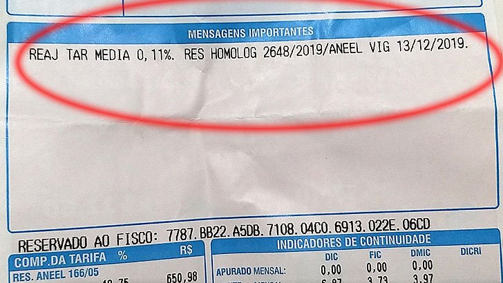 O consumidor que quiser ver a ´pegadinha´ basta consultar a fatura do mês de dezembro, que começou a ser emitida na semana passada e verificar o item ´Mensagens Importantes´, que fica logo abaixo da sessão ´Itens de Fatura´. Ali consta o seguintes dizeres: Reaj Tar. Media 0,11%. Res. Homolog 2648/2019/ANEEL. ViG 13/12/2019.