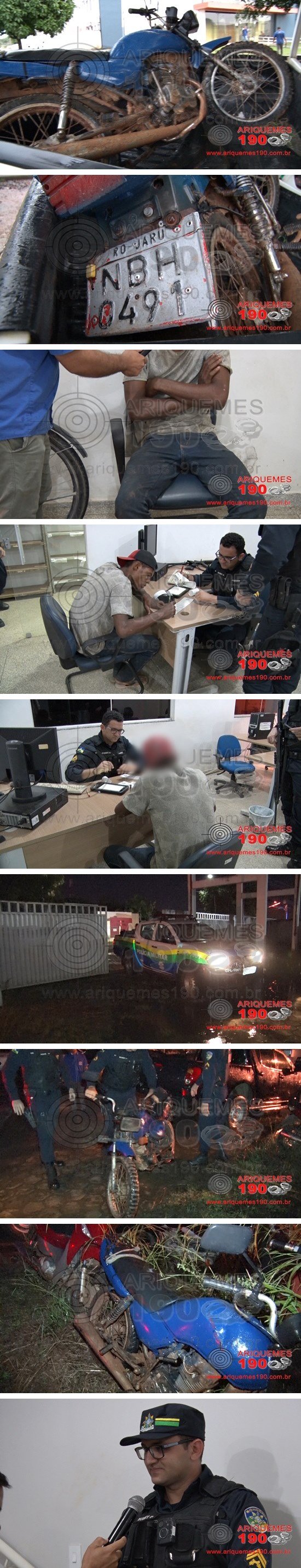 Na noite desta quinta-feira 19/12, a Polícia Militar em patrulhamento de rotina pelas ruas de Cacaulândia se deparou com duas pessoas transitando em uma moto sem capacete. Foi feita a abordagem, sendo que ao averiguar a placa da motocicleta, foi constatado que havia adulteração, onde a verdadeira placa seria outra. O condutor relatou que apenas pegou a moto emprestada de um amigo para ir trabalhar. O indivíduo também não portava os documentos do veículo. Diante do exposto, o condutor e a motocicleta foram conduzidos e apresentados na Unidade Integrada de Segurança Pública (UNISP), onde foi registrado o Boletim de Ocorrência Policial (BOP) para a tomada das providências que o caso requer.