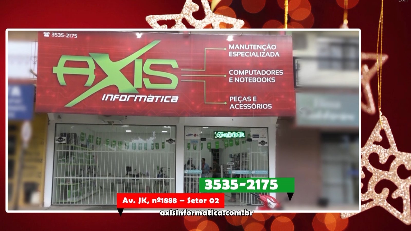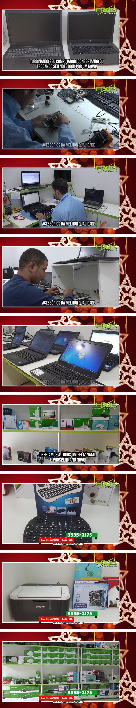 A Axis Informática sempre trabalhou para você estar o mais atualizado possível com as novidades da tecnologia, turbinando seu computador, consertando ou trocando seu notebook por um novo. Com acessórios da melhor qualidade, com mão de obra especializada. Feliz Natal, Feliz Ano e boas festas! Votos de toda equipe Axis Informática que está localizada na Av. JK ao lado Colégio Heitor 3535-2175. WhatsApp 9 8493-2221 ou acesse axisinformática.com.br.