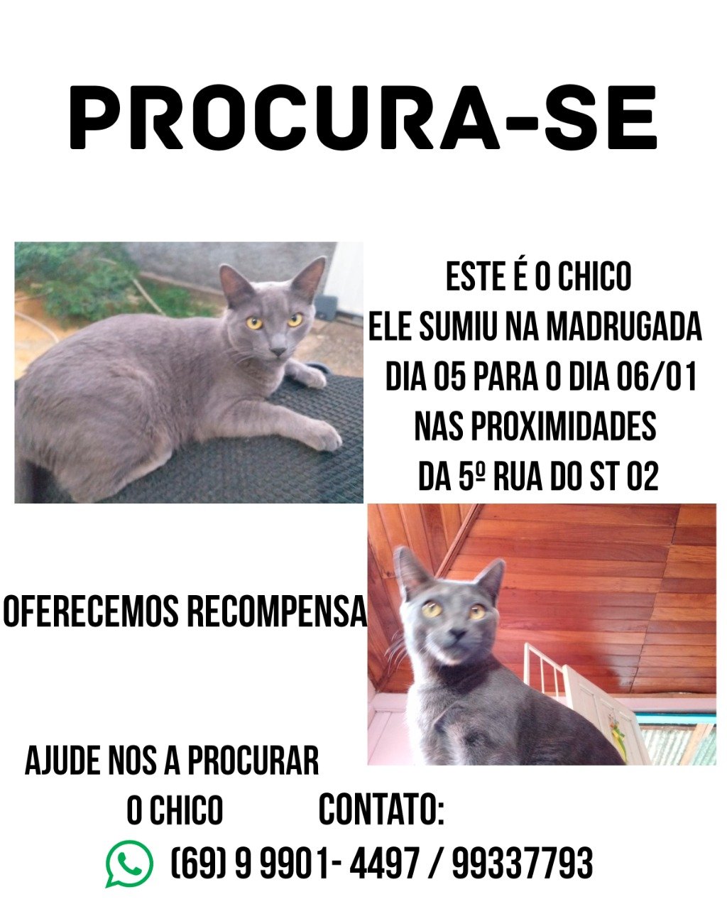 Procura-se gato que sumiu nas proximidades do setor 02 atendendo pelo nome de “chico”