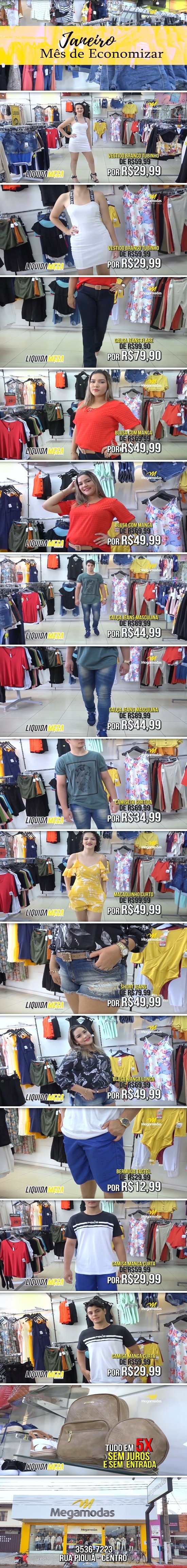 A Mega Modas está com uma grande liquidação de até 60% de desconto! É isso mesmo, São confecções a partir de R$ 12,99, vestidos a partir de R$ 29,99 e muito mais. Corra porque não vai sobrar nada. Liquida Mega da Mega Modas, se é moda é mega!