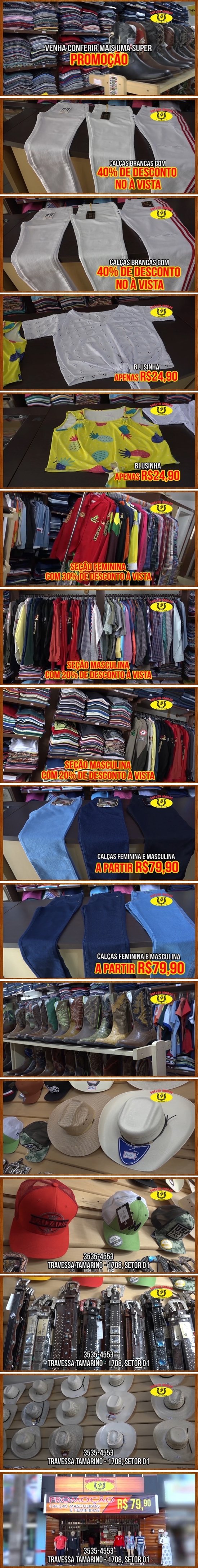 O Cowboy e a Cowgirl inteligente escolhem a Suelen Modas na hora de fazer as suas compras e ficar no estilo. O que há de melhor em moda country nos grandes centros, seja para uso no campo ou na cidade, a Suelen Modas dispõe aqui bem pertinho de você, com os melhores preços e condições de pagamento. Confira as promoções: