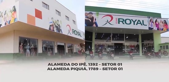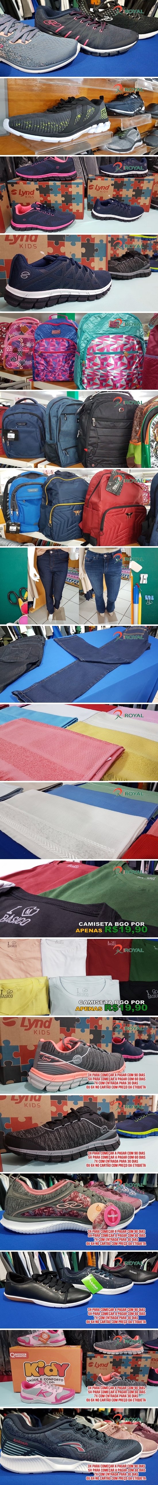 O seu volta às aulas com muita economia está nas Lojas Royal. Acabaram de chegar lindos tênis femininos e masculinos, adulto e infantil, Mochilas infantil e infanto-juvenil, calças jeans feminino e masculino, adulto e infantil, toalhinhas de mão para bordar o nome de seus filhos e muito mais. Acabaram de chegar lindas camisetas BGO em diversas cores por apenas R$ 19,90. Sua lição de economia está nas Lojas Royal, com duas lojas para melhor lhe atender, na Alameda Piquiá e Alameda do Ipê - Centro. UMA SEMPRE PERTO DE VOCÊ!