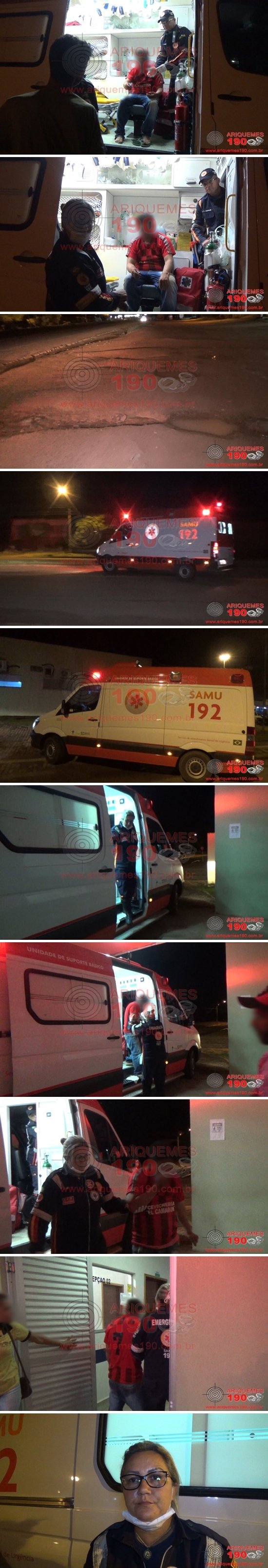 Era por volta das 22h20min desta sexta-feira, dia 24/01, quando a equipe do Serviço de Atendimento Móvel de Urgência (SAMU) foi acionada através de sua Central de Operações, a comparecer na Br-364, próximo ao trevo de Ariquemes, pois segundo informações um homem teria caído com sua bicicleta após acertar em um buraco na via, sendo que o mesmo apresentava um corte considerável na região da face. De imediato a equipe de socorro composta pela Técnica de Enfermagem Simone e Condutor Adjalmo se deslocou com a Unidade de Suporte Básico (USB) até o referido endereço, e quando chegaram no local puderam constatar a veracidade das informações, encontrando um homem caído ao solo, apresentando vários ferimentos na região da face. Imediatamente foram realizados os procedimentos de primeiros socorros à vítima, que após receber no local os atendimentos pré-hospitalares, foi encaminhada ao pronto socorro da Unidade de Pronto Atendimento (UPA) para receber cuidados médicos especializados. Ao conceder entrevista à equipe de reportagens do site Ariquemes190 e Canal 35.1 Digital, Técnica Simone relatou que, devido o trauma ocasionado pela queda, a vítima perdeu dois dentes no local. A equipe de socorro também ressaltou que a via do acidente é bastante erma, com pouca visibilidade e apresenta vários buracos, o que colaborou para o resultado apresentado. Em contato com a vítima, esta relatou à equipe médica que trafegava pela via em sua bicicleta, momento em que não percebeu o buraco a sua frente, vindo a cair ao solo.
