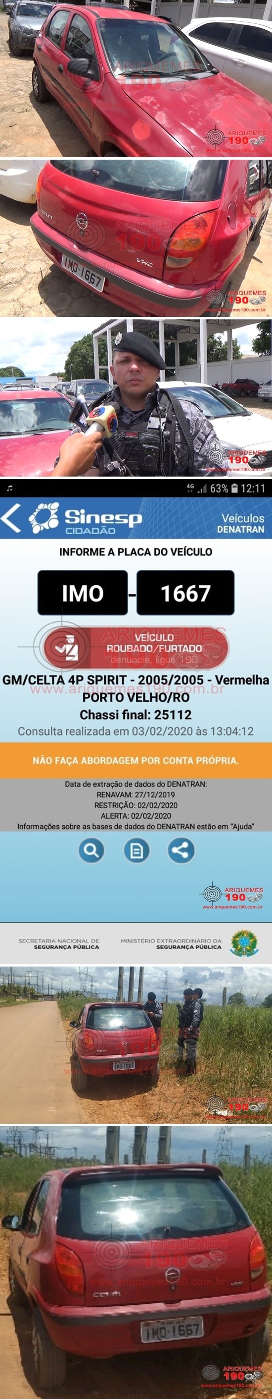 Era por volta das 14h15min desta segunda-feira, dia 03/02, quando a guarnição da Polícia Militar Patamo realizava patrulhava ostensivo pela na Av. Brasil, Bairro Condomínio Villa Bela em Ariquemes, quando em dado momento avistou um veículo marca Chevrolet, modelo Celta Spirit de cor vermelho com placas de Porto Velho/RO, que estava estacionado com os vidros abertos e portas destravadas. Por se tratar de uma forma não comum foram iniciados os procedimentos de abordagem ao veículo, mas ninguém estava dentro do mesmo. Imediatamente iniciou-se uma checagem veicular ao sistema do Departamento Estadual de Trânsito (DETRAN), quando foi constatada a procedência, que o mesmo seria produto de Roubo ou Furto ocorrido no dia 29/01/2020 na Capital. Diante das informações os policiais conduziram o veículo até o pátio da Unidade de Segurança Pública (UNISP), onde foi registrado o Boletim de Ocorrência Policial sob n° 21.755/2020, para que fossem tomadas as providências cabíveis e posterior restituição do bem ao seu dono.