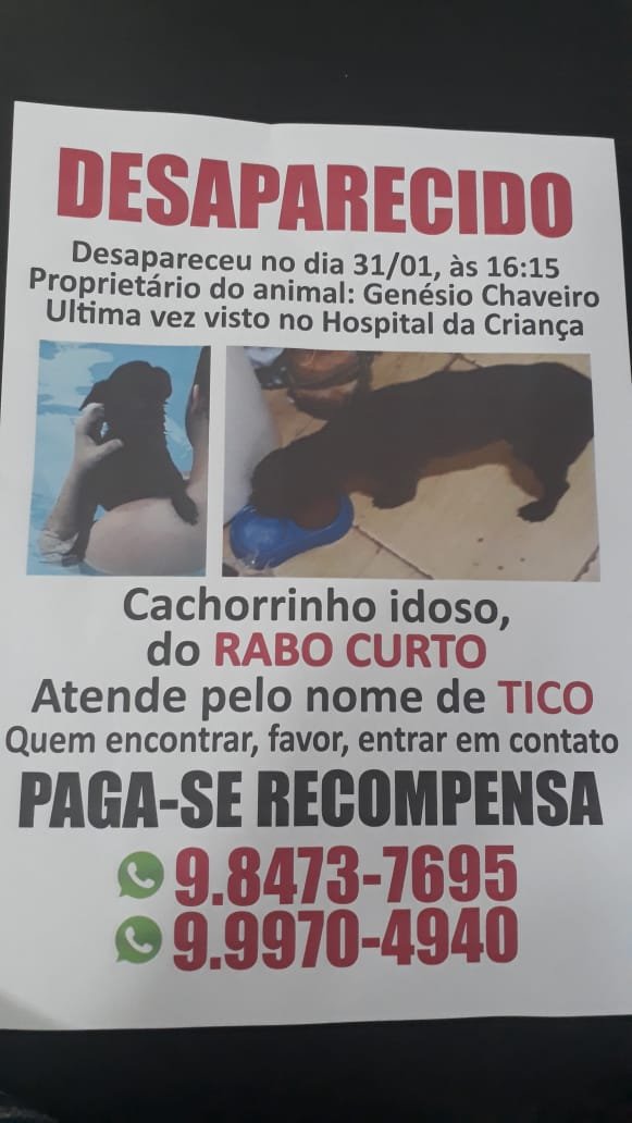 Este cachorrinho que atende pelo nome de Tico desapareceu nesta sexta-feira, dia (31/01), nas proximidades do Shopping de Ariquemes. Tico já está com a família há 14 anos e está fazendo muita falta. Quem souber de qualquer informação que leve ao paradeiro de Tico favor entrar em contato pelo telefone: 98473-7695, falar com Genésio.
