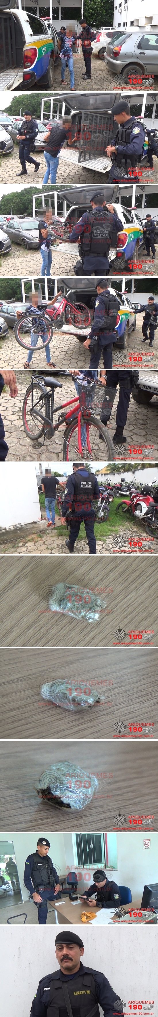 Por volta das 10h30min desta quinta-feira, dia (06/01), a guarnição da Polícia Militar realizava patrulhamento de rotina pela Av. Tancredo Neves, próximo a Av. Jamari, quando em dado momento avistaram um individuo de bicicleta sem camisa e com óculos, sendo que o mesmo ao perceber a viatura da Polícia Militar procedeu em uma manobra evasiva e demonstrando muito nervosismo. Com isso os policiais procederam a abordagem ao suspeito, sendo que em revista pessoal foi encontrado uma porção de substância de entorpecente tipo Maconha. O indivíduo, sendo menor, de 15 anos de idade, foi feito deslocamento até a residência, a fim de localizar os pais do menor para acompanhá-lo nos procedimentos necessários, os quais estavam trabalhando. Diante dos fatos a equipe do Conselho Tutelar foi acionada, onde um conselheiro acompanhou o menor ser conduzido até a Unidade de Segurança Pública (UNISP) para que sejam tomadas as providências cabíveis. A Ocorrência foi registrada sob número 23.963/2020.
