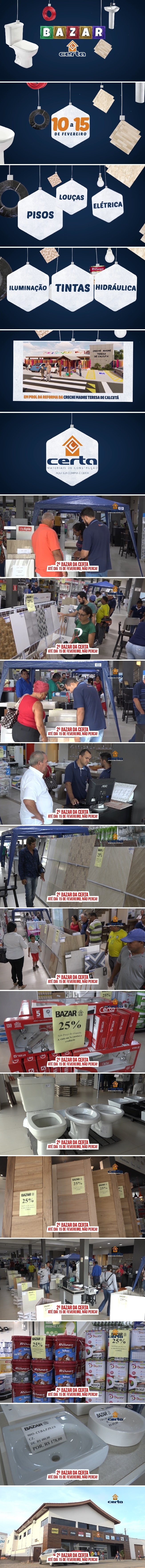 Já começou! É isso mesmo! Já começou o grande Bazar da Certa Materiais para Construção, com uma infinidade de produtos a preços incríveis. São diversos pisos ponta de estoque, louças, elétrica, iluminação, tintas, hidráulica e muito mais... Mais atenção, porque o Bazar acontece somente até dia 15 de fevereiro. Aproveite para fazer suas compras a preços nunca vistos antes e ainda ajude a quem precisa, pois parte da renda será doada para em prol da reforma da creche Madre Tereza de Calcutá. Certa Materiais para Construção, aqui a sua compra é certa! Na Avenida Jamari, Centro. Telefone: 3536-1510.