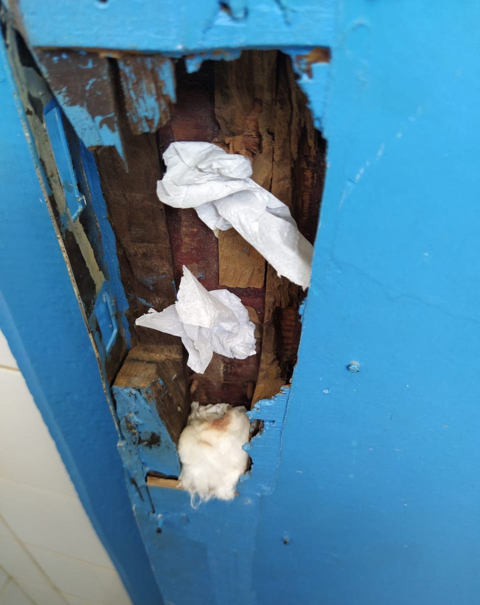 Em Machadinho D'Oeste, no Vale do Jamari, a equipe encontrou medicamentos vencidos e descartados de forma irregular, além de vários problemas na estrutura física do hospital municipal da cidade. No banheiro de uso comum da unidade, os buracos na fechadura da porta são 'tapados' com algodão e papel higiênico.