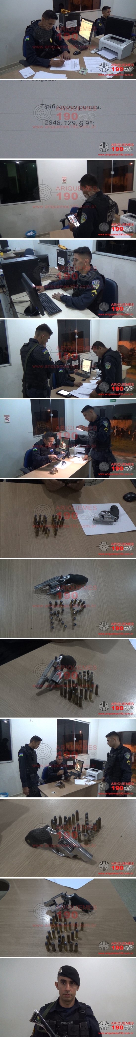 No início da noite desta sexta-feira, 14/02, por volta das 20h30m, a Central de Operações do 7º BPM acionou a guarnição da Polícia Militar Patrulha Bravo, composta pelos PMs: CB Alencar, SD James e SD Guimarães, para se deslocarem à Rua Yaci, Bairro Jardim das Flores em Ariquemes, para atender uma ocorrência de ameaça. Ao chegarem no local em uma empresa do ramo de gêneros alimentícios, encontraram a vítima, um trabalhador de 37 anos, o qual afirmou que estava no seu ambiente de trabalho, quando chegou um homem identificado como sendo E.A.R, 35 anos, com sintomas de embriagues alcoólica e sem motivo que justificasse os insultos, começou a xingar o trabalhador. A vítima, ao questionar o infrator por qual motivo se comportava desta forma, foi surpreendida no momento em que o agente jogou a cerveja que estava bebendo no rosto da vítima. Não satisfeito, o meliante passou a ameaçar a vítima dizendo que iria matá-lo, caso chamasse a Polícia. Os PMs abordaram o agente que se encontrava nas proximidades, e ao realizarem consulta ao nome dele constataram que o mesmo possuía um Mandado de Prisão referente ao processo nº 0001051-27.2018.8.22.0002, expedido pela 1ª Câmara Criminal da Comarca de Porto Velho/RO. Ao realizarem revista veicular no carro do meliante, foi localizado um revólver marca Taurus, calibre .38 municiado com cinco munições, e uma sacola plástica contendo vinte e três munições calibre .38, todas intactas. Mediante as constatações o marginal e a arma, juntamente com as munições foram apresentados na Unidade de Segurança Pública (UNISP), onde foi efetivado o registro do Boletim de Ocorrência Policial sob n° 29.948/2020, para a devida tomada de providências por parte da autoridade policial plantonista.
