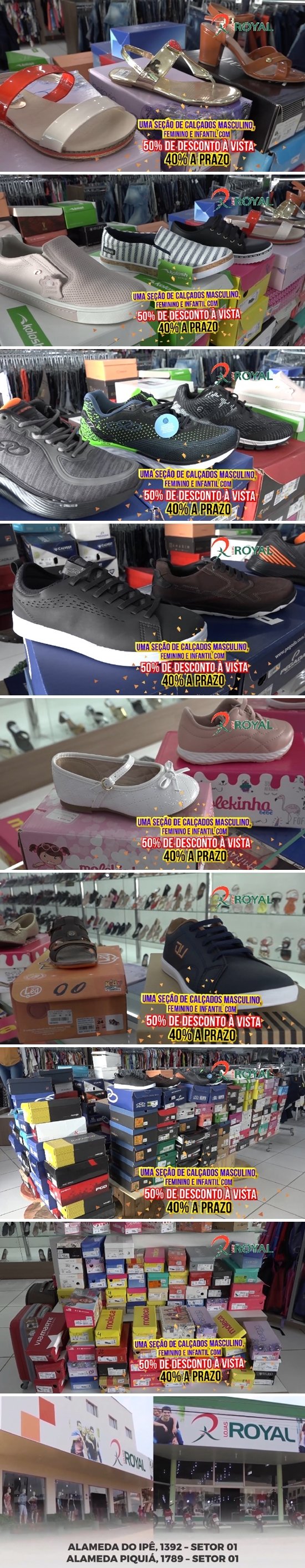 É isso mesmo! É uma seção inteira em calçados masculinos e femininos, adulto e infantil, com 50% de desconto para pagamento à vista ou 40% de desconto para pagamento a prazo, no crediário ou no cartão, e ainda pode parcelar em até três vezes. Essa você não pode perder, corra e aproveite que essa promoção é válida para as duas Lojas Royal, na Alameda Piquiá e Alameda do Ipê - Centro. UMA SEMPRE PERTO DE VOCÊ!