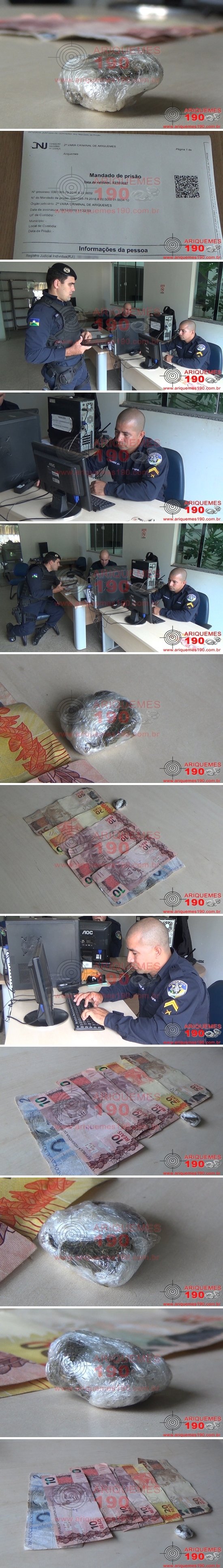 Por volta das 17h desta segunda-feira, dia 17/02, a guarnição da Polícia Militar realizava patrulhamento de rotina pela Rua Casemiro de Abreu no Bairro Colonial em Ariquemes, quando em dado momento avistou um homem o qual demonstrou muito nervosismo ao avistar a guarnição, fato que chamou a atenção dos policiais para realizarem a abordagem. Ao aproximarem do suspeito, o mesmo tentou levantar e sair do local onde estava, não logrando êxito, pois foi abordado pela guarnição. Imediatamente foi realizada revista pessoal ao elemento, o qual portava consigo uma porção de substância de entorpecente aparentando ser Maconha, e a quantia de R$ 112,00 em notas quebradas. Ao ser questionado sobre a droga e o dinheiro, o marginal informou que a substância era para seu próprio consumo, já o valor em dinheiro teria sido pego com sua mãe para quitar o aluguel, pois o mesmo encontrava-se desempregado. Questionado sobre sua identidade, o mesmo informou que seu nome seria R.A.S. 25 anos, sendo que posteriormente após alguns minutos de conversa o mesmo entrou em contradição, informando que seu nome seria R.O.S. 25 anos, não conferindo com a primeira identificação. Em consulta ao Banco Nacional de Mandados de Prisões, foi constatado um Mandado de Prisão em seu desfavor, expedido pela 2ª Vara Criminal da Comarca de Ariquemes. Mediante as constatações o meliante foi conduzido até a Unidade de Segurança Pública (UNISP), juntamente com a porção de entorpecente e o dinheiro, sendo assim registrada a Ocorrência Policial sob número 31.618/2020, para que sejam encaminhadas as devidas providências necessárias.