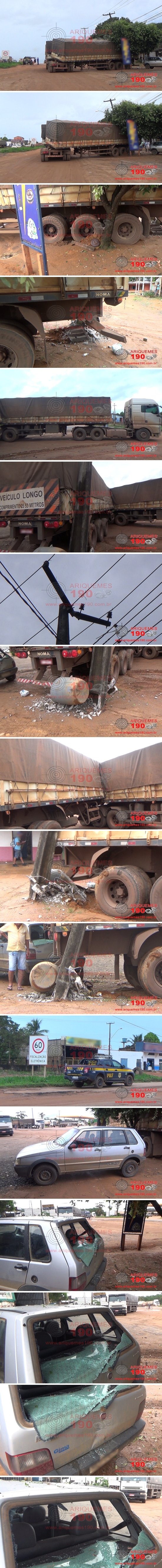Por volta das 11h30min desta quinta-feira, dia 27/02, a patrulha da Polícia Rodoviária Federal (PRF) foi acionada a comparecer na marginal da rodovia BR-364 sentido Jaru, Bairro Marechal Rondon em Ariquemes, pois segundo informações uma carreta a qual estava estacionada havia perdido seu freio e desceu desgovernada, colidindo com um poste e um veículo que estava estacionado. Diante das informações a equipe se deslocou até o referido endereço, onde puderam constatar a veracidade das informações, sendo que avistaram a carreta bi trem, a qual havia parado em “L”, colidida com um poste de alta tensão e um veículo Fiat/Uno de cor prata, o qual estava estacionado. Em contato com populares que estavam no local na hora do fato, estes relataram que o motorista parou o veículo e foi almoçar, sendo que em dado momento aconteceu uma pane nos freios da carreta, que veio a descer desgovernadamente, colidindo com o poste e o Uno estacionado. A PRF coletou as informações para registro do Boletim de Ocorrência Policial e permaneceu no local até a retirada do veículo.