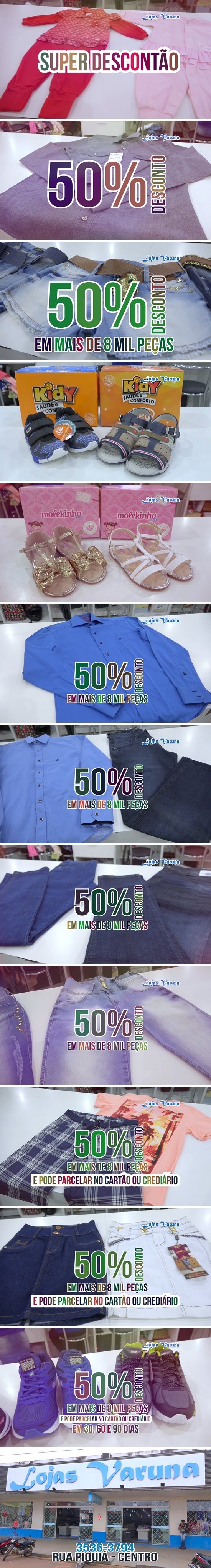 A Lojas Varuna está com uma promoção imperdível, são mais de 8 mil peças com 50% de desconto à vista no crediário ou cartão.