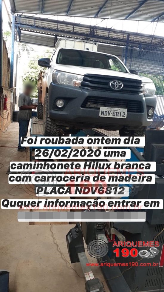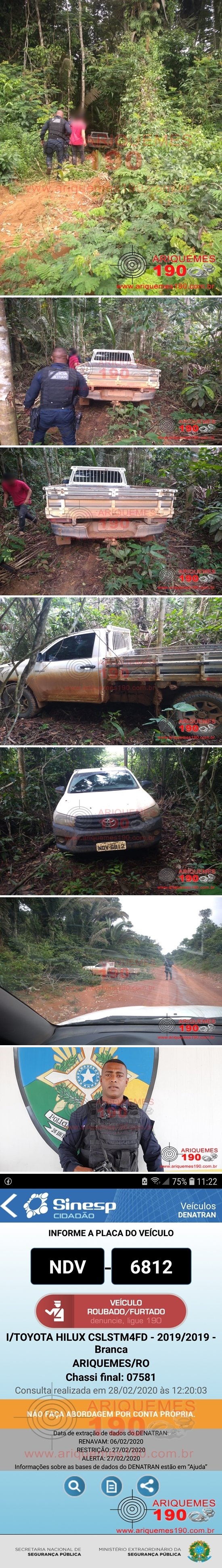 A guarnição da Polícia Militar do município de Alto Paraíso composta pelos policiais: Sgt. Daniel, CB J. Martins e SD Thebalde, foram acionados por um homem o qual teria sido vítima de um roubo dias atrás, onde na ocasião os meliantes subtraíram da vítima uma caminhonete Toyota/Hilux com placas de Ariquemes/RO, sendo que na data de hoje o mesmo teria achado sua caminhonete dentro da mata em uma picada localizada no Travessão B-30, entre as linhas C-85 e C-80 em Alto Paraíso. Diante das informações imediatamente os policiais se deslocaram até o referido endereço, onde chegando na picada mata à dentro puderam constatar a veracidade das informações, sendo que a referida caminhonete estava escondida em a cerca de 40 metros dentro da mata. Diante dos fatos foi feito deslocamento com a caminhonete até a Delegacia de Polícia do município de Alto Paraíso, onde foi registrado Boletim de Ocorrência Policial sob n° 38.334/2020, para que sejam tomadas as providências cabíveis ao fato.