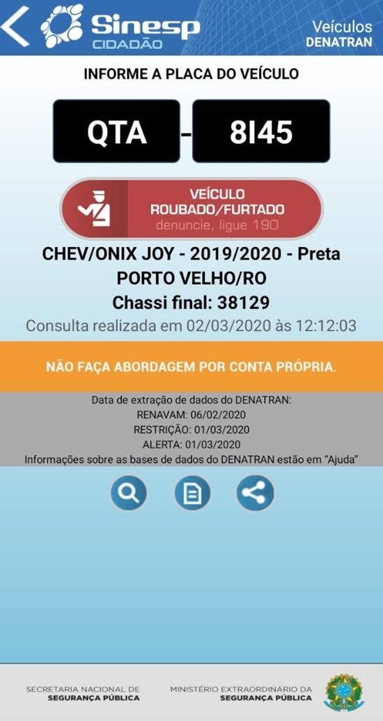 Em um belíssimo trabalho realizado pela Polícia Militar em Monte Negro, através de informações do Núcleo de Inteligência da Polícia Militar, resultou na recuperação de um veículo roubado da região de Porto Velho. O fato aconteceu na manhã desta segunda-feira, 02/03, quando a guarnição da PM composta pelos policiais: Cabo Rocha e Soldado Hugo, de posse dessas informações iniciaram diligências na BR-421, quando aproximadamente na altura do Km-49 avistaram o veículo suspeito, sendo um Chevrolet/Onix de cor preto com placas de Porto Velho/RO e realizaram a abordagem. Ao realizar consulta veicular ao sistema do Departamento Estadual de Trânsito (DETRAN), constatou-se que se tratava do veículo roubado. Ao ser questionado sobre o carro, o condutor identificado como sendo V.S., 43 anos, relatou que teria pego emprestado com seu primo para transportar seu tio de Nova Dimensão até Ouro Preto do Oeste, e que estava retornando no momento da abordagem. Com o condutor nada de ilícito foi encontrado. Mediante a confirmação do crime de Receptação, o infrator foi encaminhado juntamente com o veículo a 1° Delegacia de Polícia Civil de Monte Negro, onde foi efetivado o registro do Boletim de Ocorrência Policial sob n° 40.091/2020, para que após a realização dos procedimentos necessários, o veículo seja restituído ao seu legítimo proprietário.