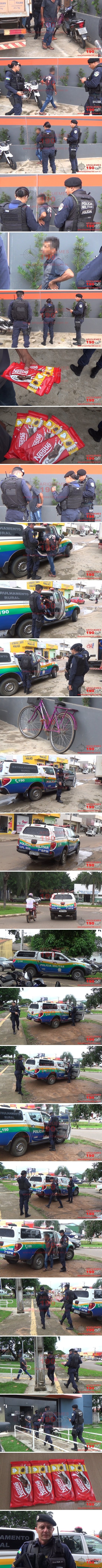 Por volta das 08h20min desta sexta-feira, dia 06/03, a guarnição da Polícia Militar foi acionada via Central de Operações a comparecer em um Mercado localizado na Rua Fortaleza, Setor 03 em Ariquemes, pois segundo informações o segurança do estabelecimento teria detido em flagrante um elemento furtando produtos. Diante dos fatos os policiais se deslocaram até o referido endereço, onde ali chegando avistaram o elemento J.R.P., 41 anos, detido pelo vigia, o qual em relatou à guarnição que avistou através do sistema de monitoramento o elemento escondendo quatro barras de chocolate Nestle dentro das vestes. Em seguida, quando o meliante iria se evadir do local, foi pego em flagrante pelo vigia e funcionários. O elemento J.R.P. possui Tornozeleira Eletrônica de Monitoramento e foi conduzido até a Unidade de Segurança Pública (UNISP), onde a ocorrência número 42.909/2020 foi registrada, para que sejam tomadas as providências cabíveis ao fato.