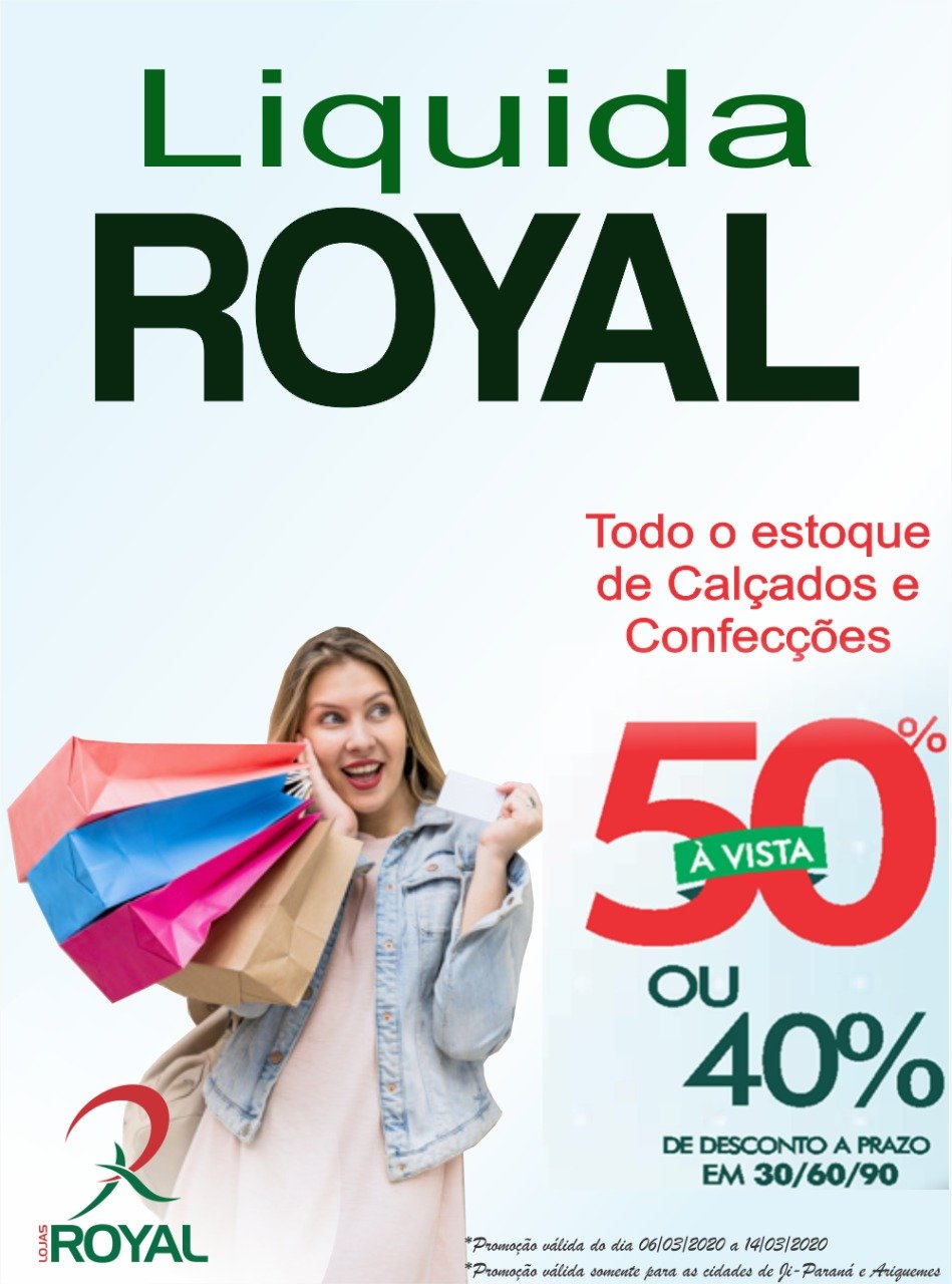JÁ COMEÇOU! É isso mesmo! Já começou a melhor promoção e mais esperada do ano, é a mega Liquida Royal! Todo estoque de calçados e confecções, adulto e infantil com 50% de desconto a vista, ou 40% de desconto a prazo em até 3x. Muita gente já está aproveitando e só está faltando você! Liquida Royal de 06 a 14 de março. Promoção válida para as duas lojas, na Rua Piquiá e Al. do Ipê. Uma sempre perto de você!