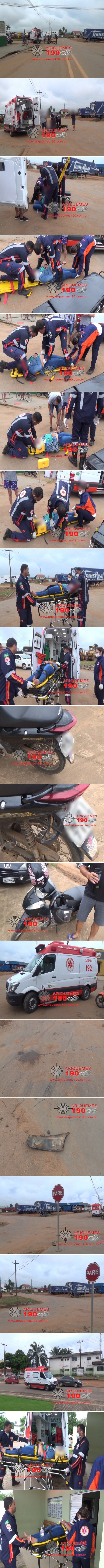 Já por volta das 08h50m de domingo, 15/03, a Central do Serviço de Atendimento Móvel de Urgência (SAMU) recebeu nova solicitação em seu número funcional (192), para enviar uma equipe de socorro na Av. Canaã com Av. Massangana, Bairro Industrial em Ariquemes, pois teria ocorrido um acidente entre carro e moto e uma vítima estaria ferida. Rapidamente os socorristas se deslocaram ao endereço solicitado, onde ali chegando encontraram uma mulher que estava sentada em meio à via, a qual apresentava várias escoriações pelo corpo em decorrência a queda. De pronto foram iniciados os procedimentos pré-hospitalares, onde a vítima foi imobilizada utilizando colar cervical, red block e em prancha rígida, onde posteriormente foi entregue na Unidade de Pronto Atendimento (UPA) para receber atendimento médico da equipe de plantão. No local populares informaram à nossa equipe de reportagens que a vítima trafegava com seu esposo em uma motoneta Honda/Biz de cor preta com placa de Ariquemes/RO, quando foram impactados por uma colisão traseira ocasionada pelo veículo VW/Fox de cor cinza, também com placas de Ariquemes/RO, onde o casal veio a cair ao solo. O esposo da vítima, que conduzia a motoneta nada sofreu.