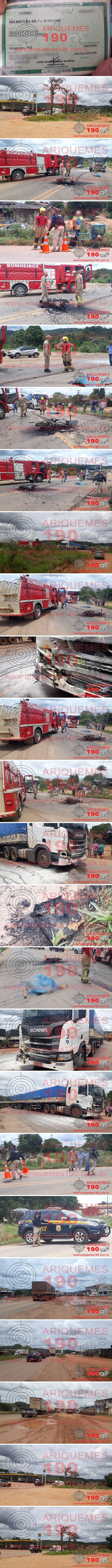 Segundo informações ainda extraoficiais dão conta que no fim da manhã dessa segunda-feira, 16/03 por volta das 11h40m, um motociclista veio a óbito após colidir frontalmente com uma carreta. O fato aconteceu na Br-364, sentido Jaru, próximo ao Posto São Vicente. Após o impacto a motocicleta incendiou, ficando completamente queimada, sendo que as chamas atingiram a parte frontal da carreta. A vítima foi identificada como sendo Neldeci da Silva Ronconi, que iria completar 21 anos na semana que vem, dia 24/03.