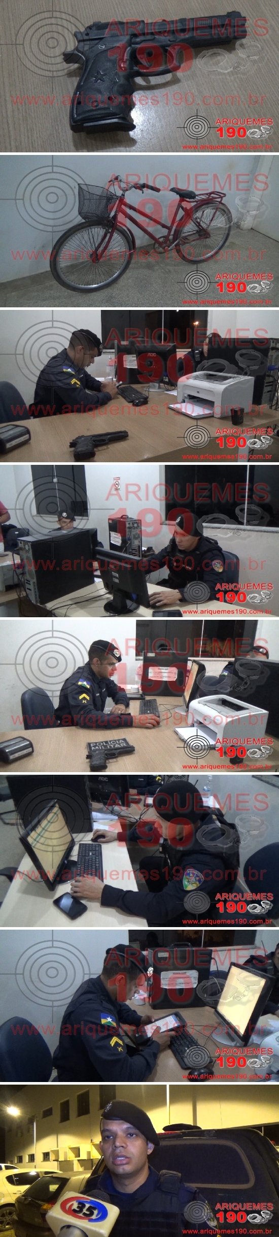 Na noite desta segunda-feira, por volta das 21h23m, a guarnição da Polícia Militar realizava patrulhamento de rotina pela Rua das Orquídeas, Setor 4 em Ariquemes, quando avistaram dois elementos em uma bicicleta modelo feminina de cor vermelha, transitando no local do fato um pouco atrás de uma senhora, esta também em uma bicicleta, sendo que o garupa estava com a mão na cintura. Quando eles perceberam que a viatura se aproximou, ficaram muito nervosos, e antes que os elementos praticassem o delito, fora estes abordados pelos policiais, que, ao realizarem revista pessoal aos marginais, foi encontrado com o menor de 15 anos de idade um simulacro (arma de fogo) tipo pistola em sua cintura. Mediante a constatação os marginais foram encaminhados para a Unidade de Segurança Pública (UNISP) e apresentados, juntamente com o simulacro e a bicicleta ao comissário da Polícia Civil, onde foi efetuado o registro do Boletim de Ocorrência Policial sob n° 49.832/2020 com acompanhamento do Conselho Tutelar, para tomada dos procedimentos cabíveis.
