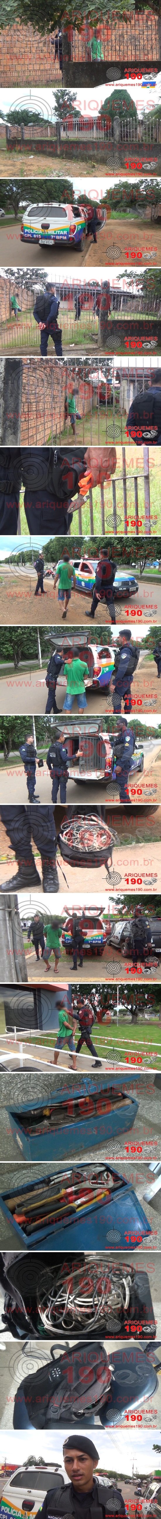 A denuncia teria sido realizada à Central do 7° BPM através do seu número funcional (190), na tarde dessa terça-feira, por volta das 16h30m, a qual dava conta de que um indivíduo trajando camiseta de cor verde, bermuda Jeans cor azul, boné preto e com uma mochila preta na costa teria pulado o muro de uma residência localizada na Avenida Rio Branco, Bairro Jardim Jorge Teixeira em Ariquemes, com uma caixa de ferramentas na mão. Rapidamente a Central encaminhou para o local a guarnição da Polícia Militar patrulha Bravo, composta pelos policias: CB Reis, SD Gregório e SD Machado, onde nas proximidades do endereço a guarnição localizou e abordou o suspeito com as características informadas. Questionado sobre os objetos em sua posse, o elemento confessou que teria furtado tais objetos de uma residência no local citado na denuncia em uma casa abandonada e levou a guarnição na residência. Lá o marginal mostrou aos policiais como entrou na residência, erguendo o portão e se dirigindo para a parte dos fundos, mostrando uma porta aberta e de onde subtraiu os fios. Foi possível verificar que a porta da residência havia sido arrombada. A caixa de ferramentas o meliante relatou que pegou em um compartimento no fundo do quintal. Diante do exposto e a confissão do ato ilícito, os policiais conduziram o elemento para a Unidade de Segurança Pública (UNISP), onde este foi apresentado ao comissário de plantão, juntamente com o produto do furto para registro do Boletim de Ocorrência Policial sob n° 50.420/2020, para tomada de providências cabíveis.